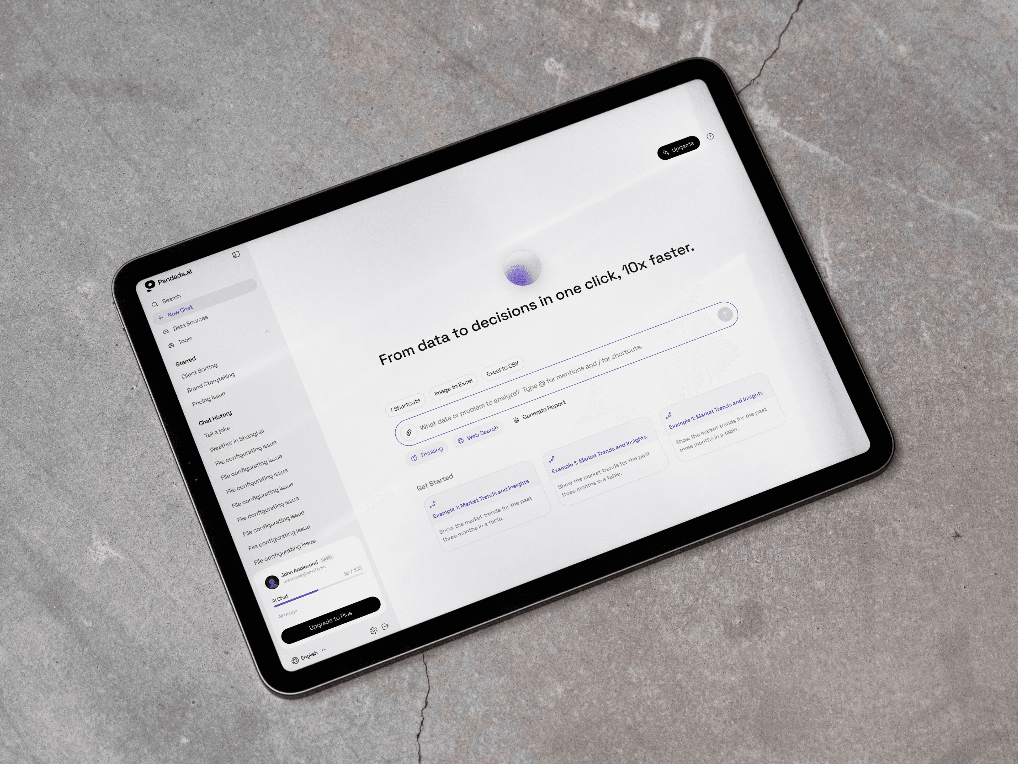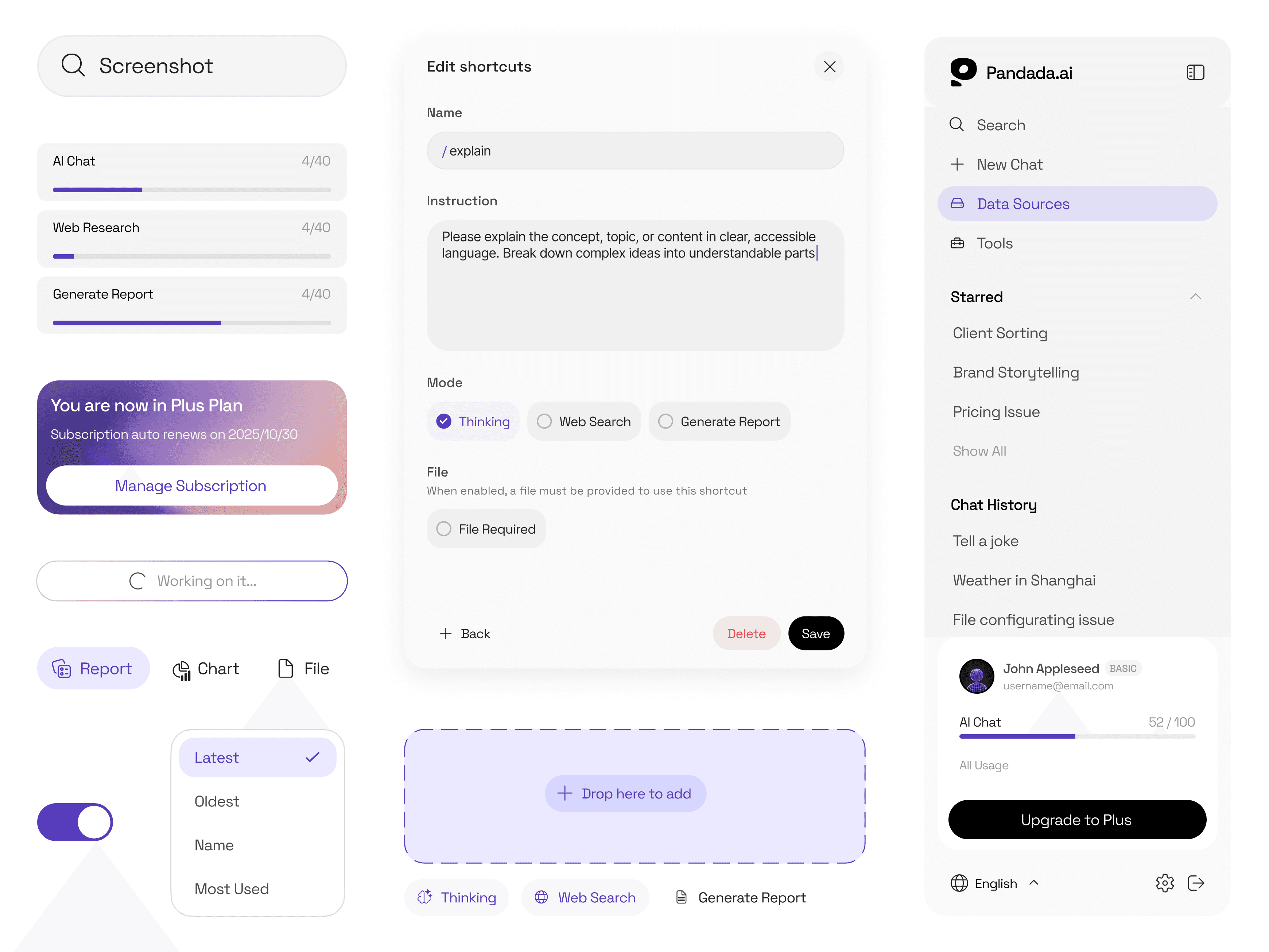 Pandada 同时服务非技术背景的业务决策者与数据科学家,产品的核心用户大量来自运营和业务端。他们对数据有诉求,但对"数据正在被怎样处理"这件事天然缺乏掌控感。 这决定了我们在产品设计中最优先考虑的事:状态的可读性。 每一个处理环节都有清晰的解释,文件的预览、编辑、导出、每一步都给予充分反馈。用户不需要理解背后的技术逻辑,但他们始终知道当前发生了什么。 在整体产品调性上,和市面上主流的数据工具拉开了距离——远离深色仪表盘和高密度图表语言。Pandada 的界面更轻,信息层级克制。我们希望用户打开产品的第一感受是舒适、可控——功能在需要时出现,其余时刻安静退后。 整个产品的设计语言围绕两个关键词展开:简洁与温度。 让一个能力极强的 AI 引擎,在体验层面表现得从容、友好,像一个高效且值得信赖的协作者。